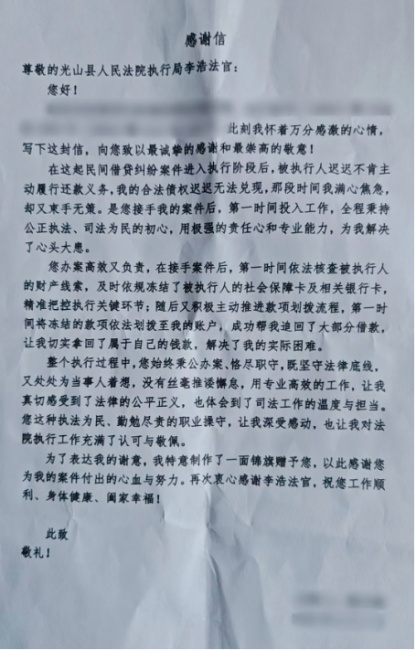 这天,一名头发花白的老人走进光山法院,将一面印着“高效执行追欠款 尽心尽责暖民心”的锦旗交到执行法官手中,同时送上一份感谢信。